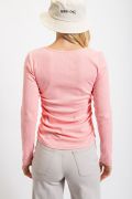This soft pink top is designed with a boat neckline and constructed entirely from ribbed knit fabric. It has long sleeves and side ruching, offering a sleek and flattering silhouette.