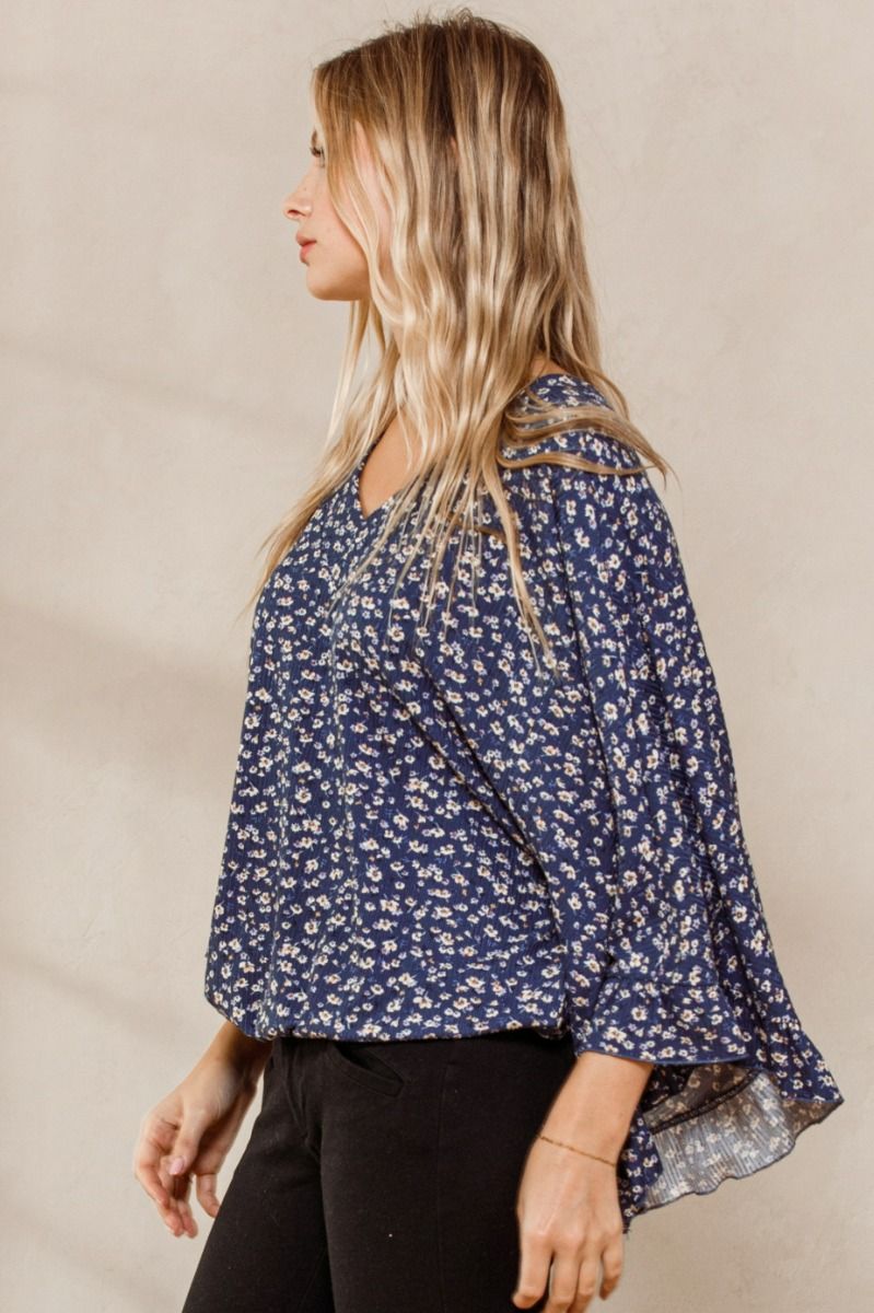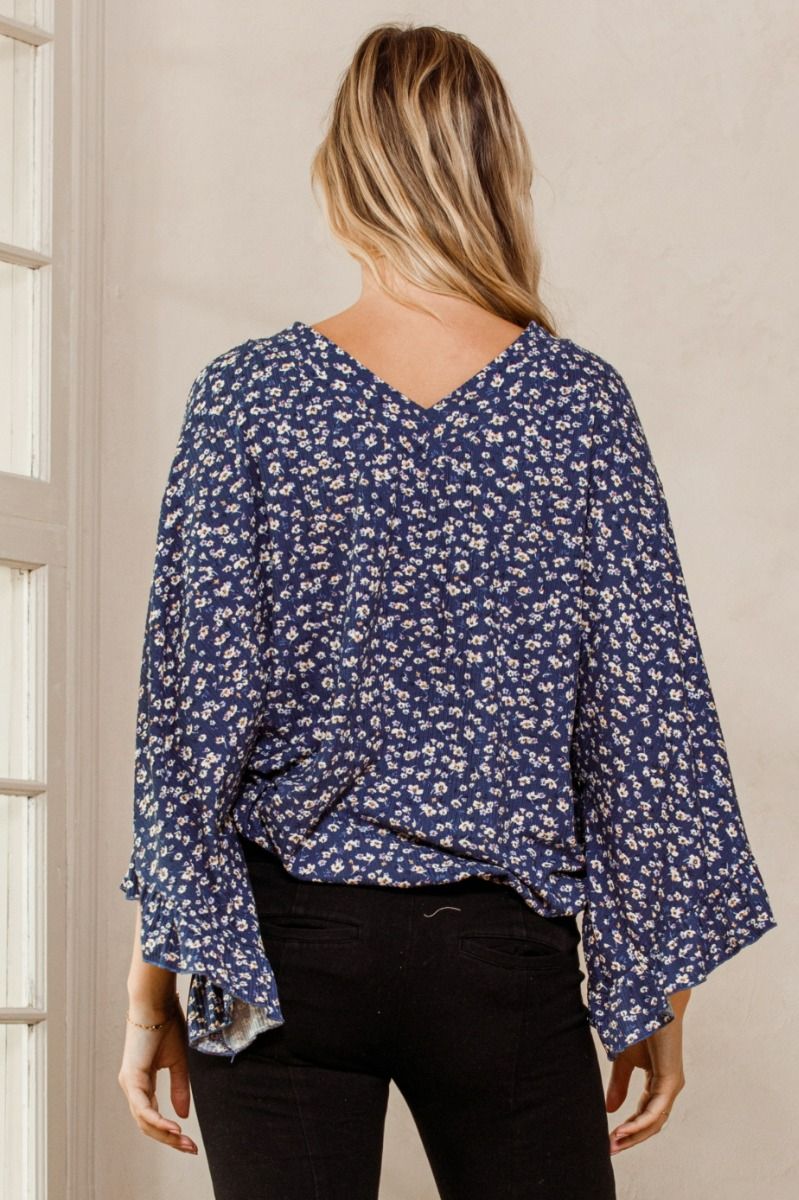 Dreaming in Denim Blue Top | Double V-Neck Ruffled Bell Sleeve Floral Top