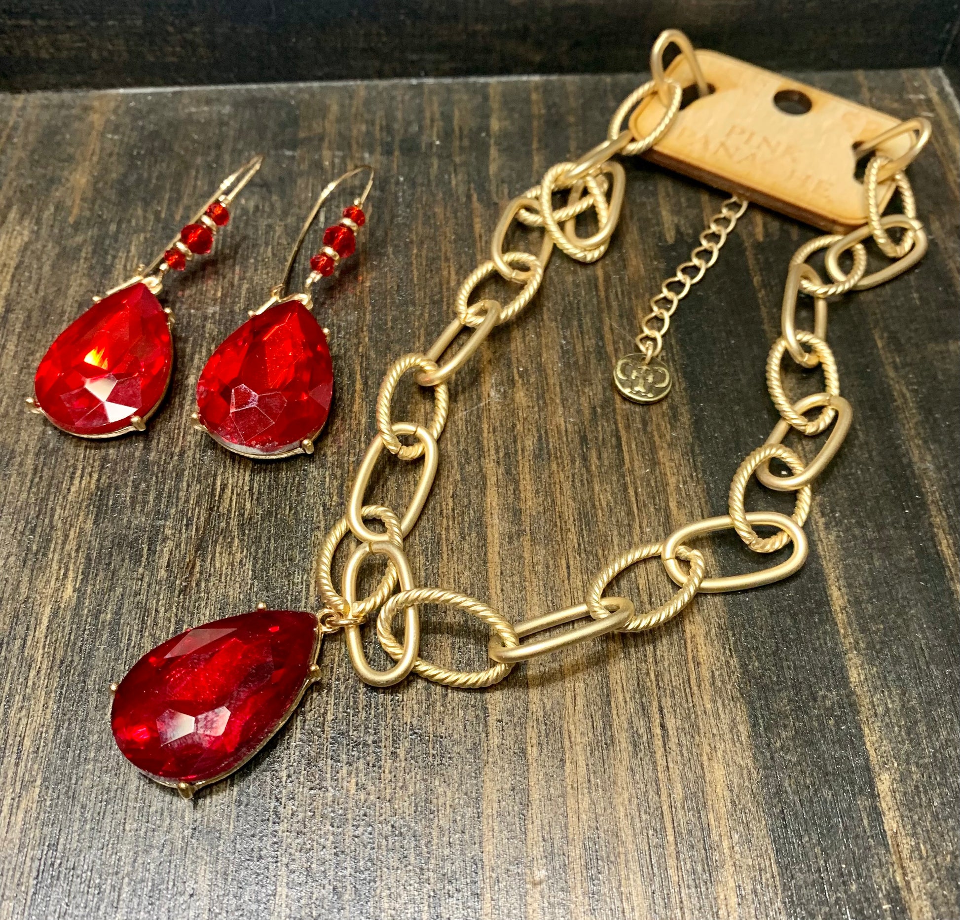 This Gold Chunky Link Chain Necklace by Pink Panache features a striking Red Rhinestone Teardrop. Made with high-quality materials and expert craftsmanship, this necklace is sure to make a statement and elevate any outfit..