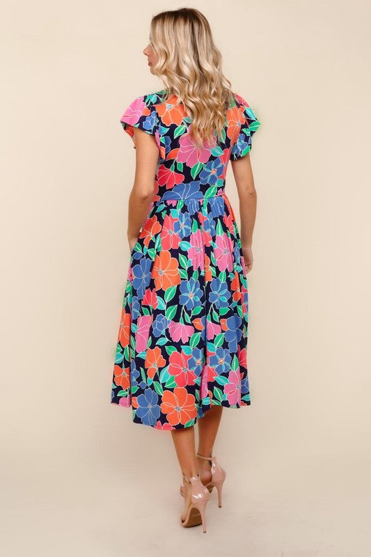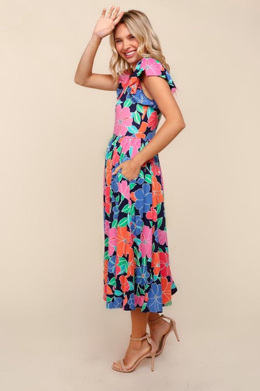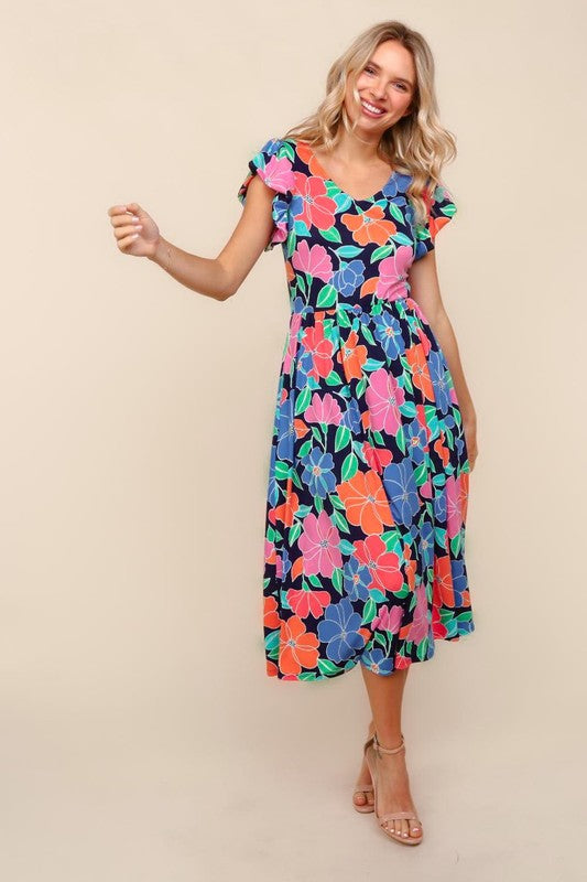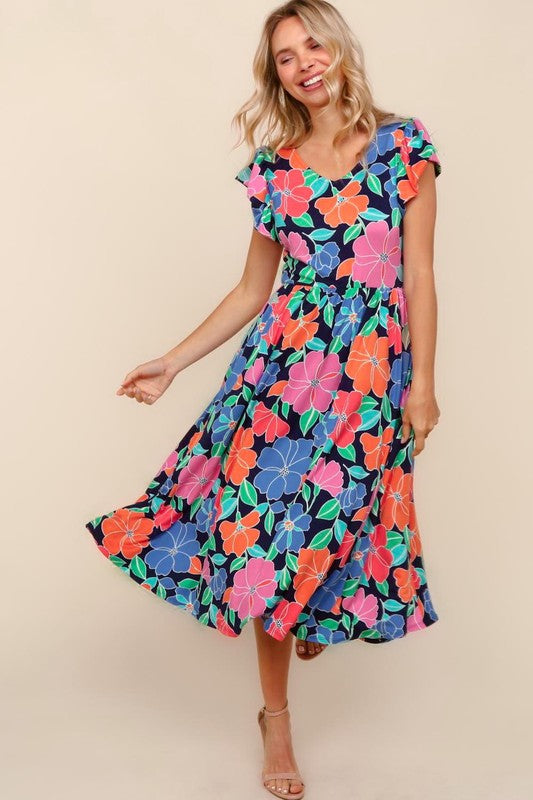 This blue floral midi dress features a fit-and-flare silhouette with a flattering V-neckline and folded ruffle short sleeves. Crafted from buttery smooth knit fabric, it offers comfort and style, while convenient side pockets add practicality. The babydoll fit enhances its feminine appeal, making it a perfect choice for every occasions.