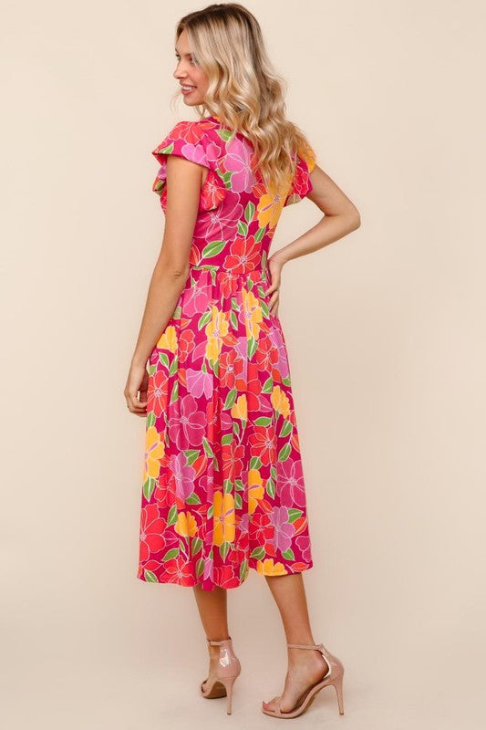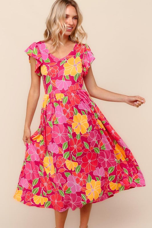 This pink floral midi dress features a fit-and-flare silhouette with a flattering V-neckline and folded ruffle short sleeves. Crafted from buttery smooth knit fabric, it offers comfort and style, while convenient side pockets add practicality. The babydoll fit enhances its feminine appeal, making it a perfect choice for every occasions.