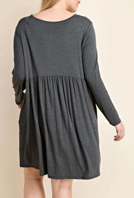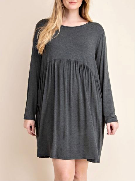 Charcoal Gray Scoop Neckline dress with long sleeves, tiered hem and side pockets! So SOFT. BAMBOO FIBER!