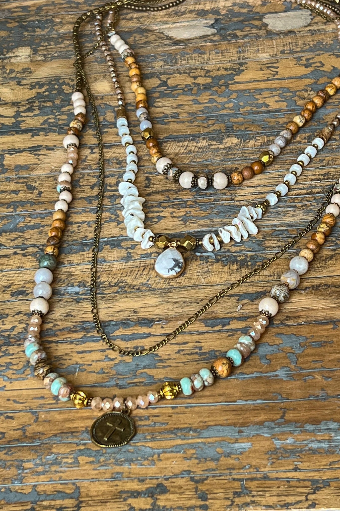 This four-layer necklace combines bronze chains with an assortment of stone and glass beads. It features a lobster clasp and a 2-inch extender for adjustable length. The shortest layer is a delicate bronze chain, while the shortest beaded layer measures approximately 9.5 inches. The middle and longest layers showcase varied stone and glass beads, each adorned with dangling pendants. The longest layer extends to about 17 inches, creating a sophisticated, layered look.