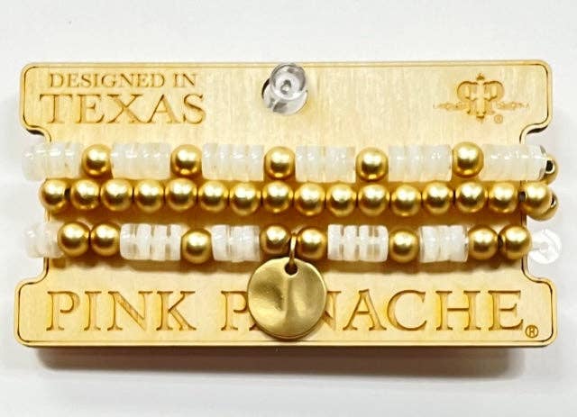 This elegant bracelet set features three individual strands combining gold beads with white mother-of-pearl disc beads, accented by a delicate gold coin charm. Designed to fit most wrist sizes comfortably.