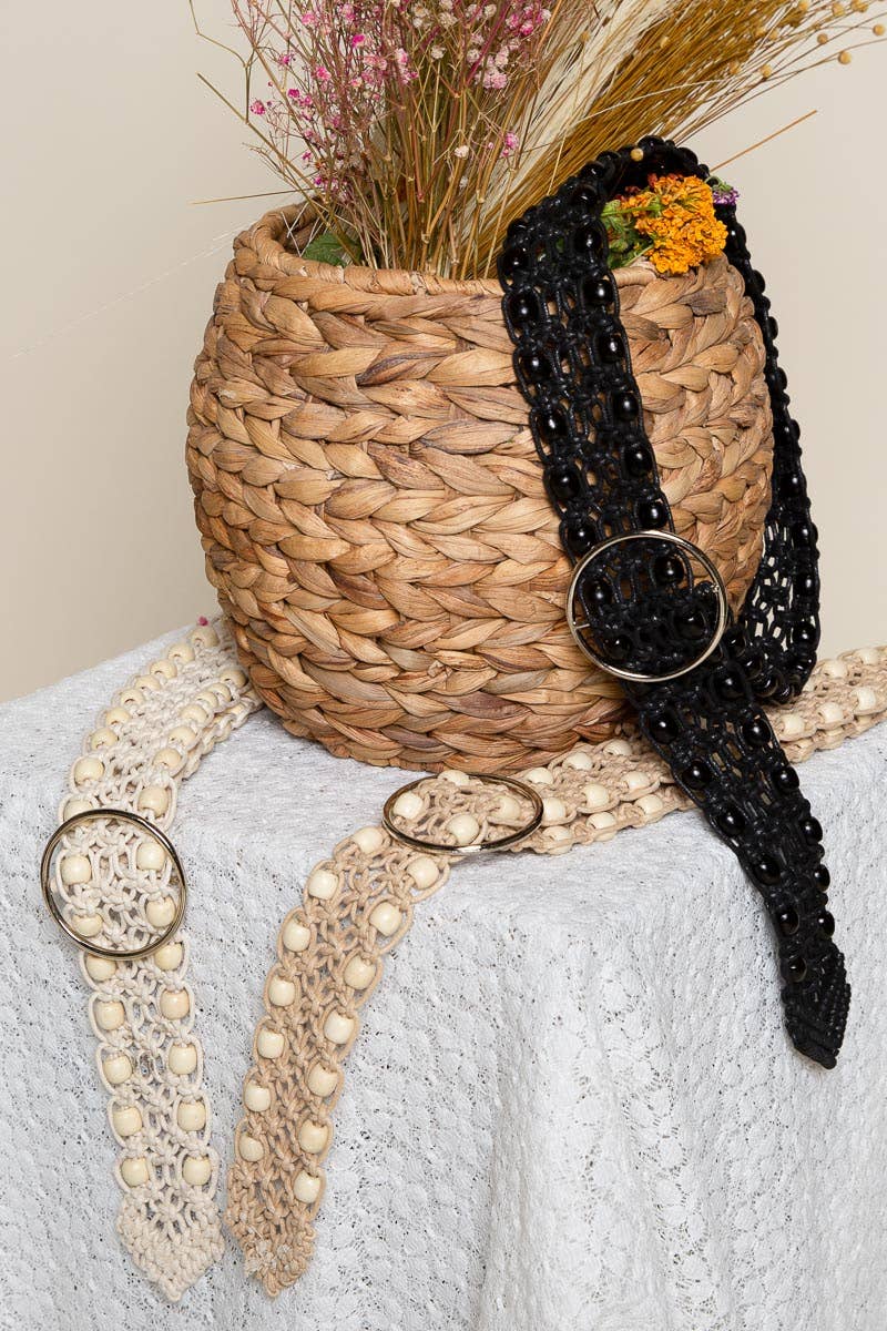 This leatherette belt features a twisted and knotted string pattern accented with beads, finished with a sophisticated silver 'O' ring buckle.
