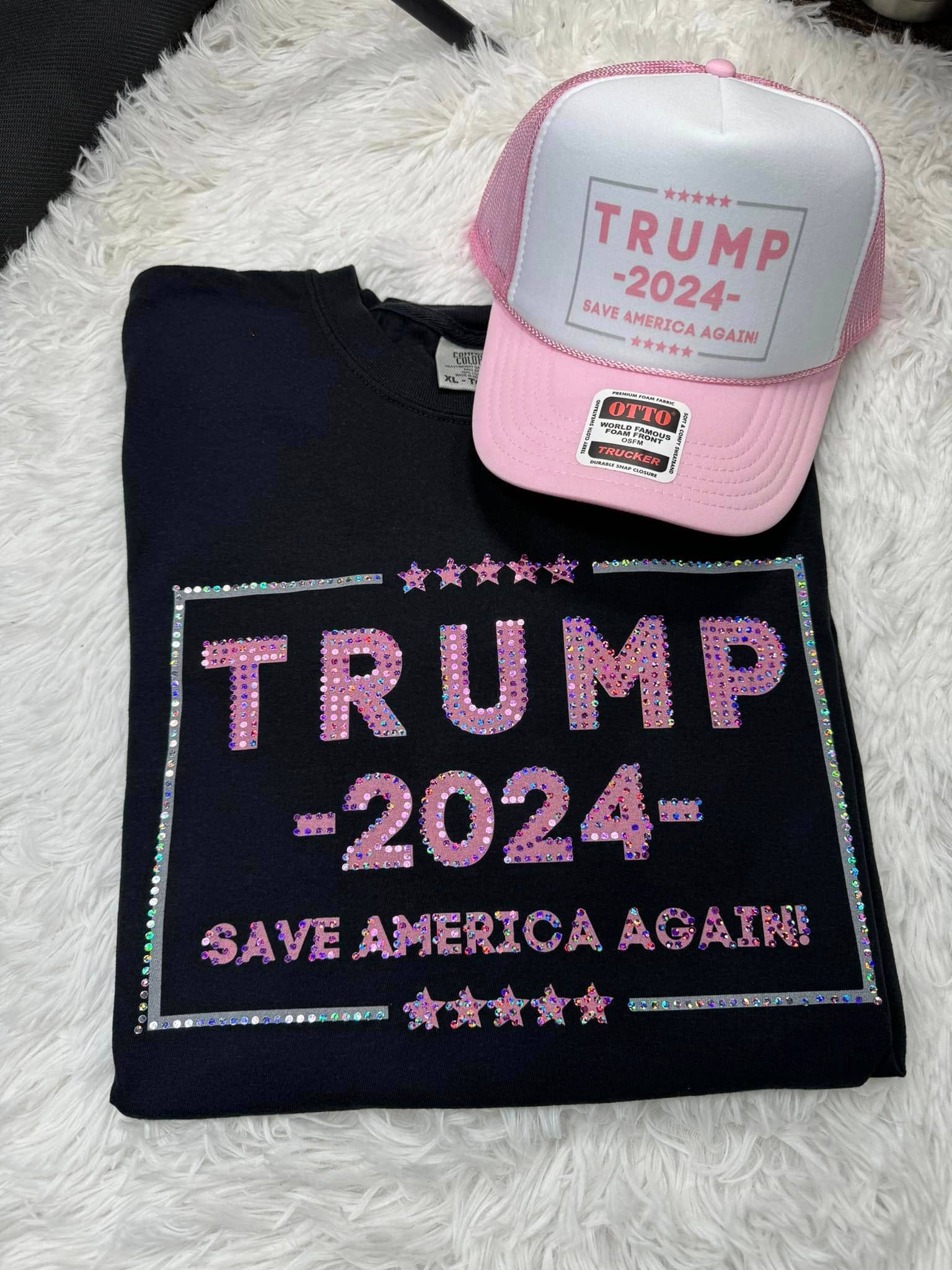 Show your support for America with our 2024 Save America Sparkle Tee! Crafted with dazzling sparkle detailing, this tee makes a bold statement while adding a touch of sparkle to your wardrobe. Whether you're attending a rally, celebrating Independence Day, or simply showing your love for your country, this tee is the perfect choice.