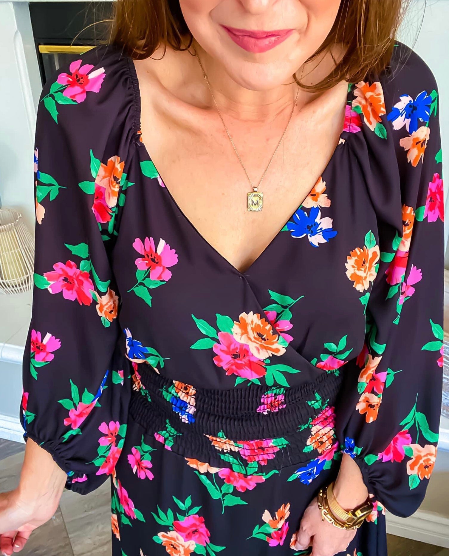 This DRESS! you will be SO IN LOVE with this DRESS! Black Foral Dress with Elastic sleeves, smocked waist and fully lined by Peach Love California. 100% Polyester
