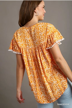 Tangerine animal print top featuring a split neck, ruffle sleeves with Pom Pom fringe detail and flower embroidery by UMGEE.