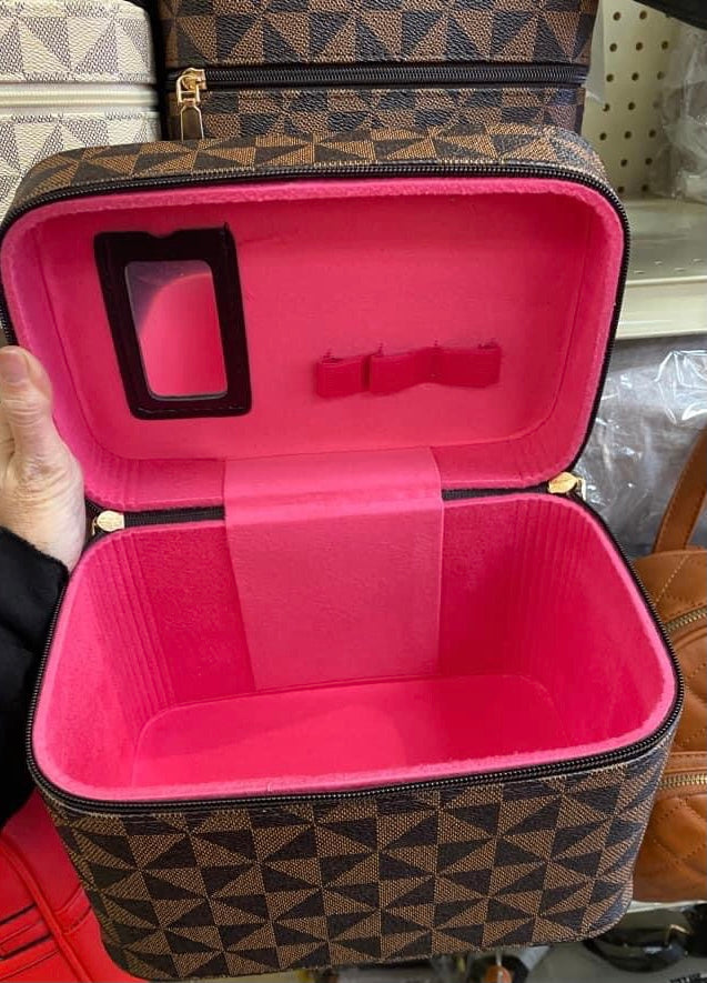 High Quality Train Cases are Brown Design Print with Hot Pink Lining. Sold as set of 3.