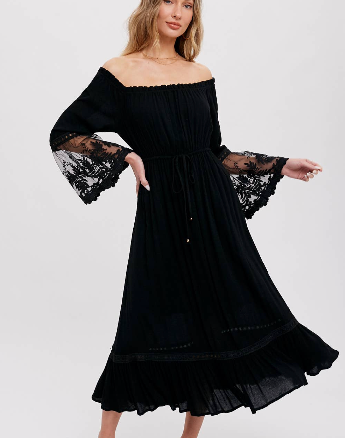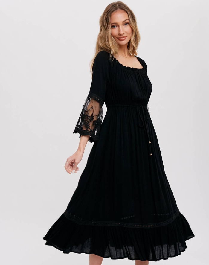 This black woven dress by Bluivy showcases a refined lace-trimmed bell sleeve, an elastic neckline, and a cinched waist with a self-tie strap. Crafted from 100% rayon, it offers a graceful, flowing silhouette accented with subtle gold hardware.