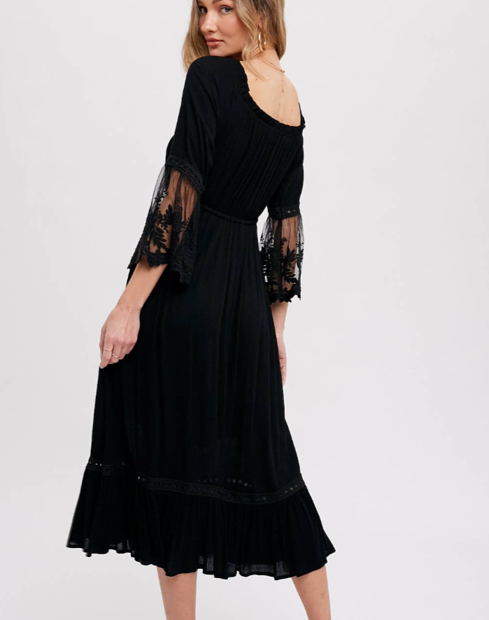 Waiting For You Black Dress | Lace Trim Bell Sleeve Midi Black Dress